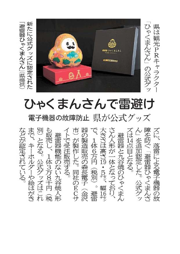 「避雷器ひゃくまんさん」が北國新聞に紹介されました!
