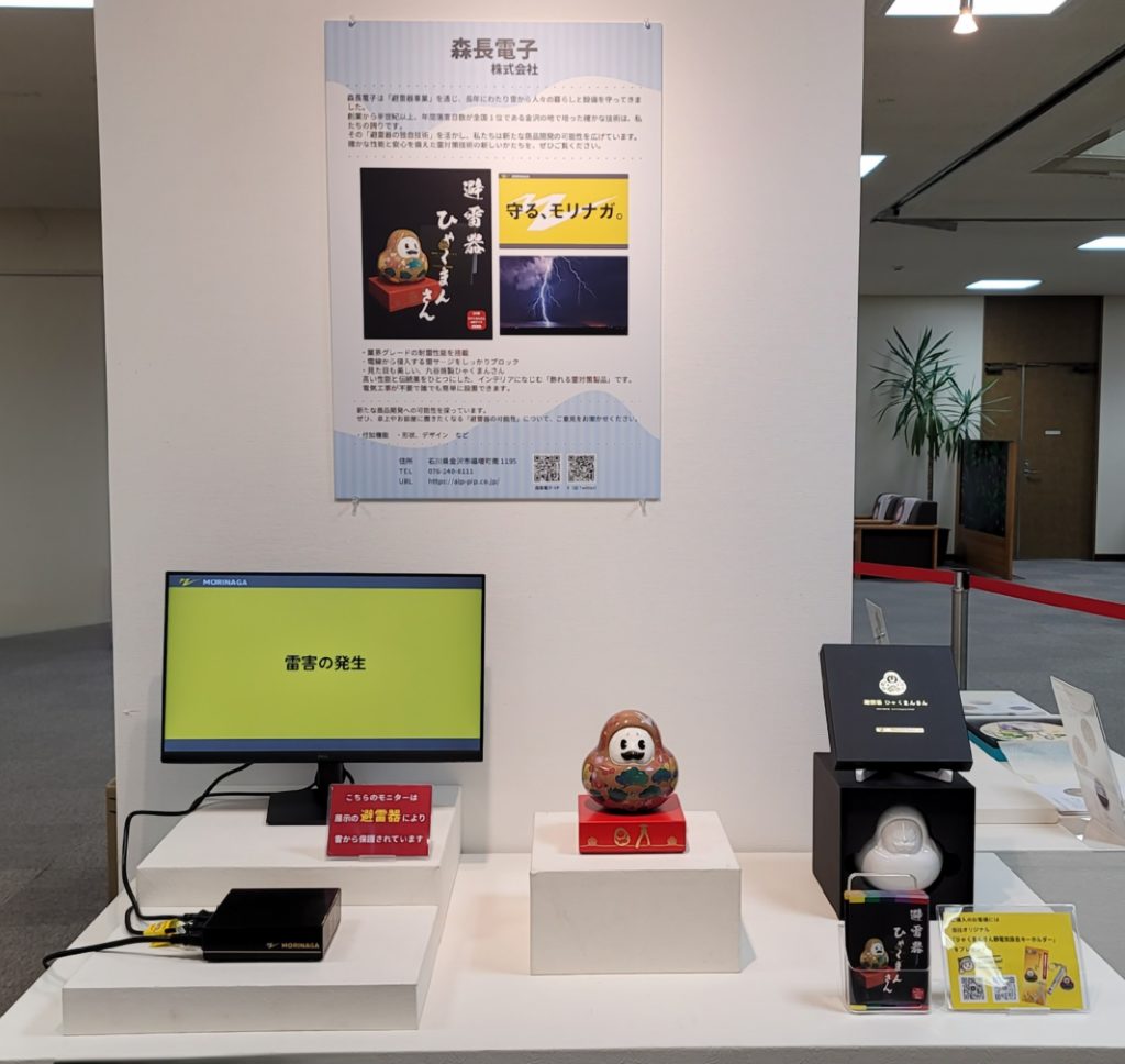 飾れる雷対策製品「避雷器ひゃくまんさん」の魅力を、実物展示とパネルでご紹介しております。
